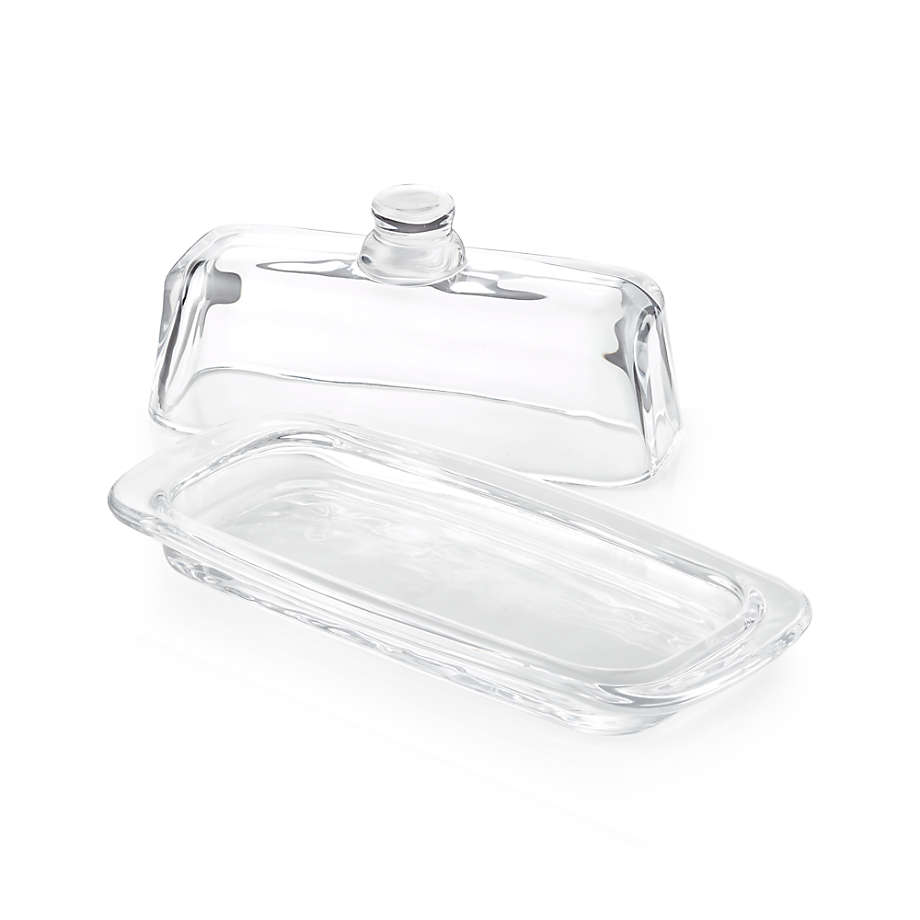 Thick curves of glass shape a classic butter dish. Topped with an articulated knob for easy lifting, the glass lid protects a stick of butter and makes for a charming presentation at brunch or on the dinner table.