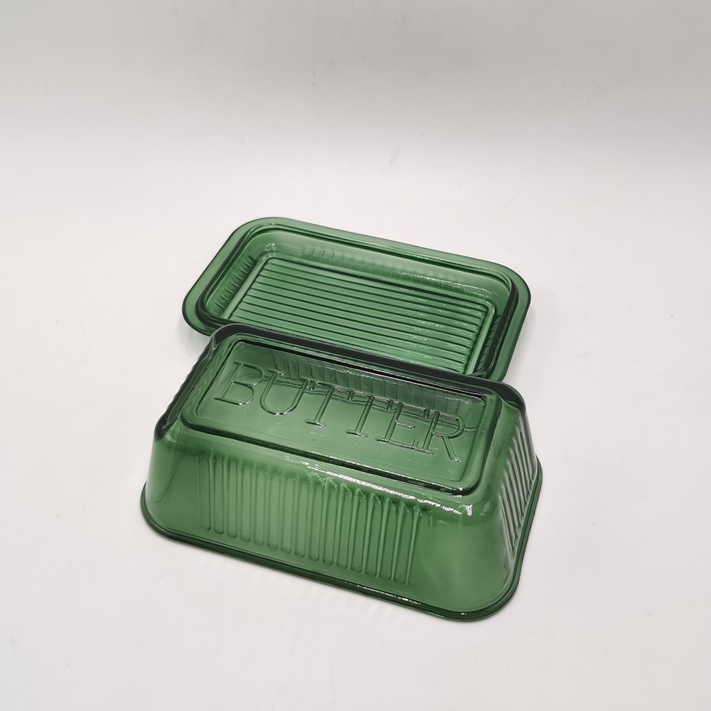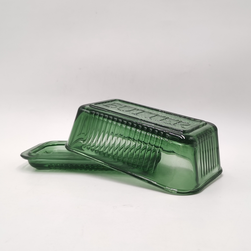 Thick curves of glass shape a classic butter dish. Topped with an articulated knob for easy lifting, the glass lid protects a stick of butter and makes for a charming presentation at brunch or on the dinner table.