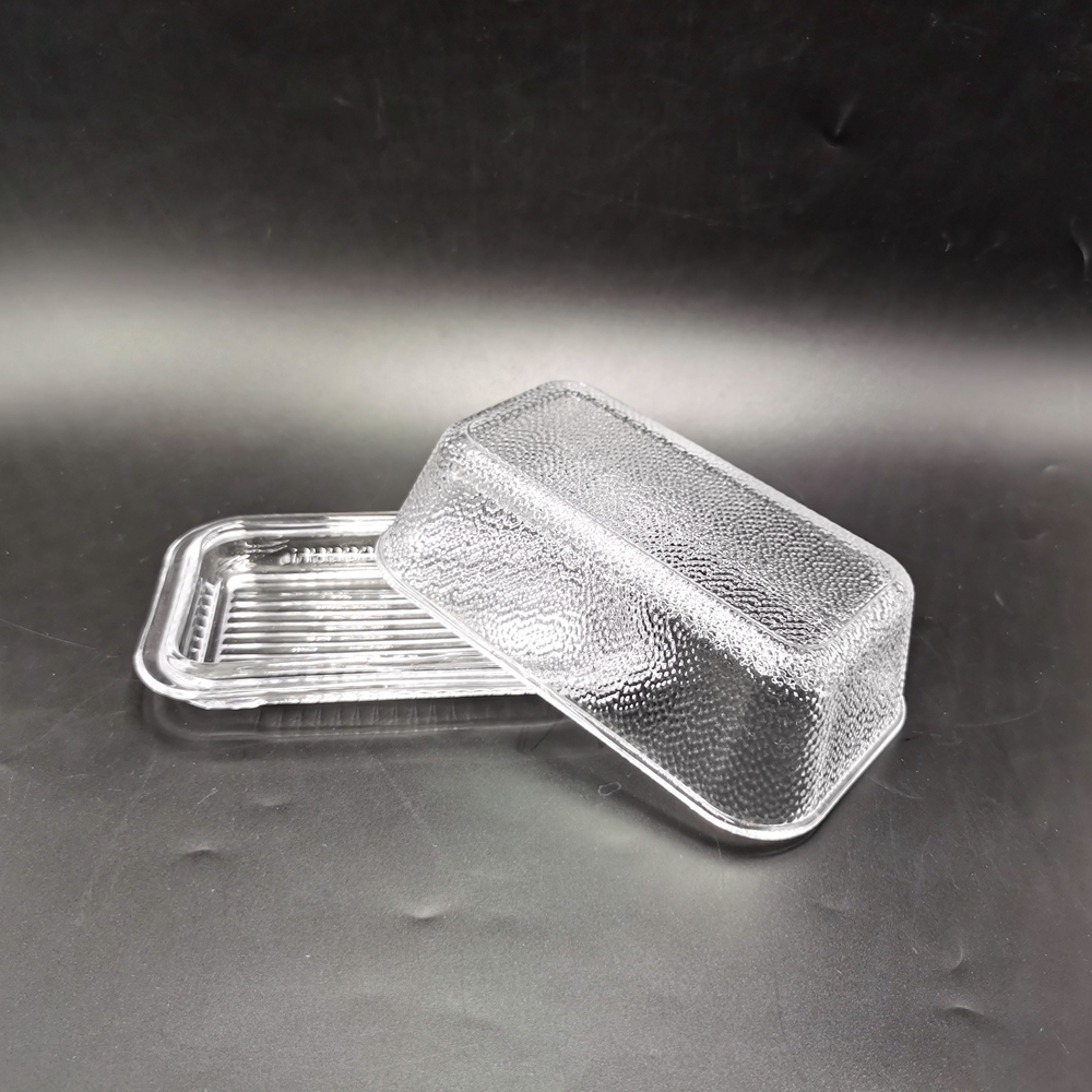 Thick curves of glass shape a classic butter dish. Topped with an articulated knob for easy lifting, the glass lid protects a stick of butter and makes for a charming presentation at brunch or on the dinner table.