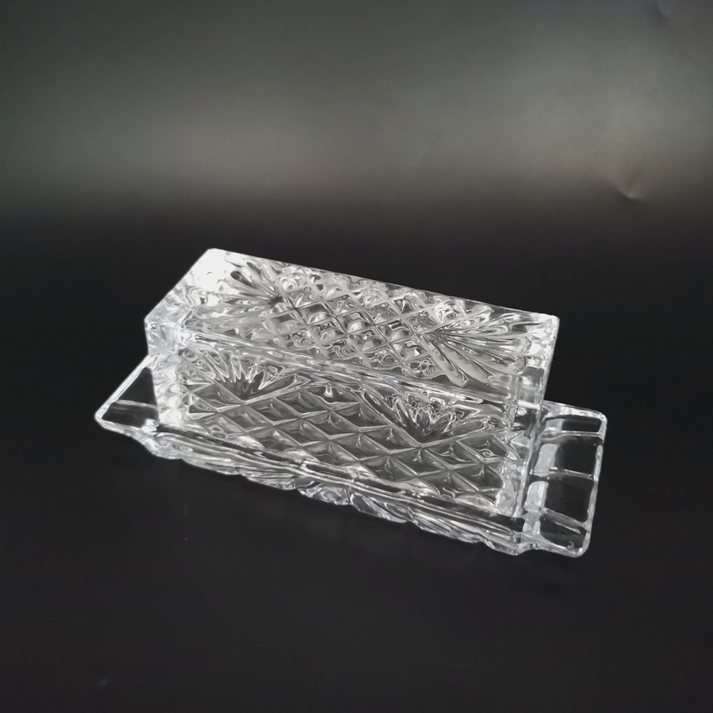 Thick curves of glass shape a classic butter dish. Topped with an articulated knob for easy lifting, the glass lid protects a stick of butter and makes for a charming presentation at brunch or on the dinner table.