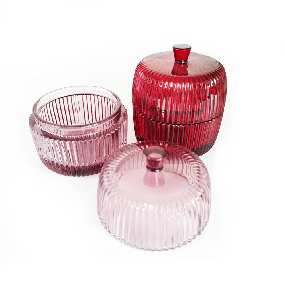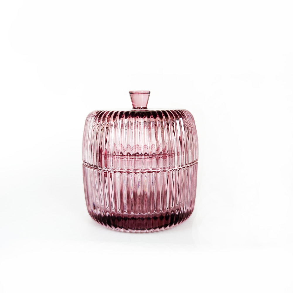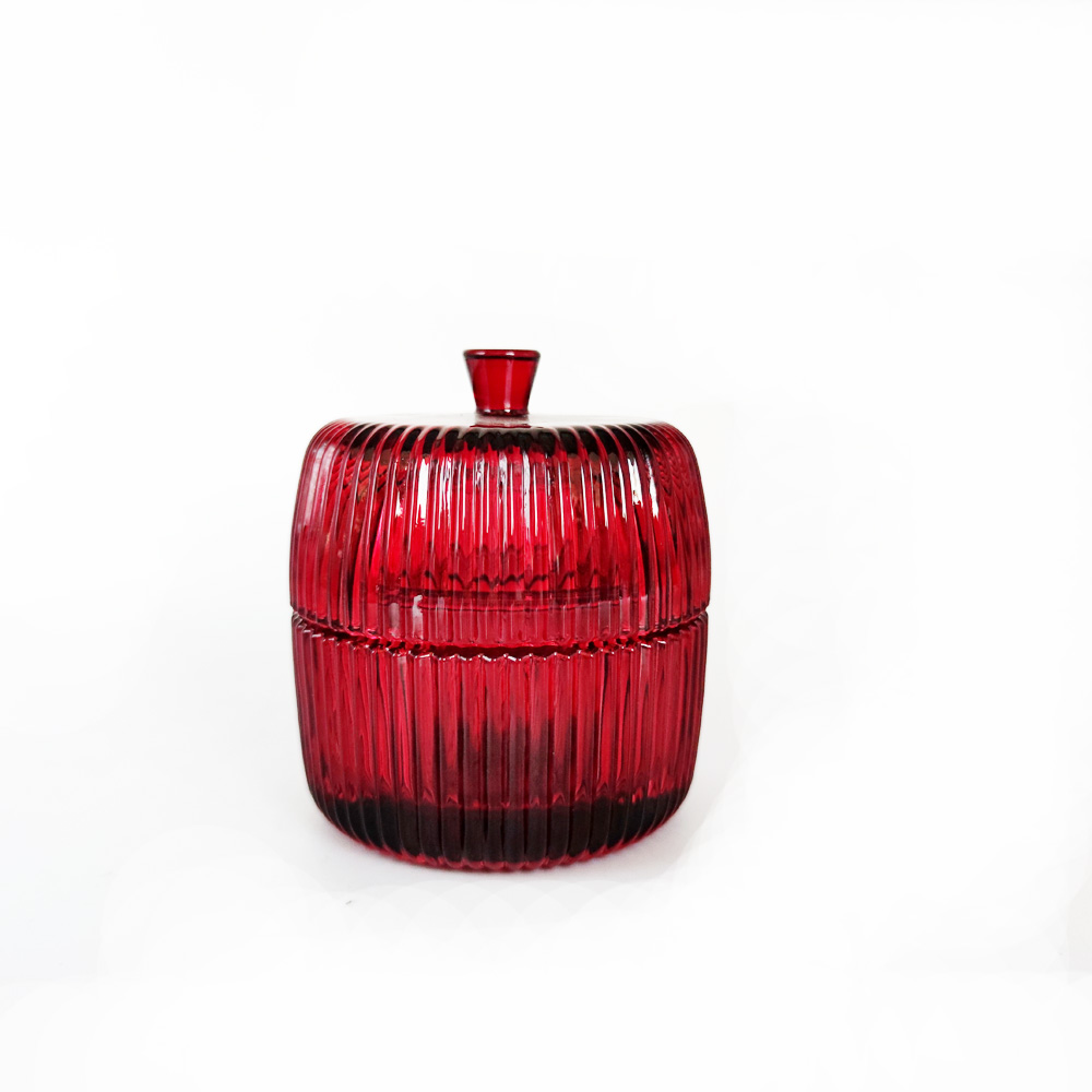Description | Vertical line pattern colored glass candle jar with glass handle-type lid