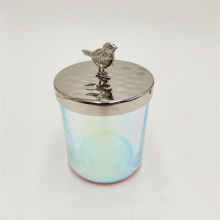 Description | Fancy Iridescent Glass Candle Jar With Metal Bird Lid |