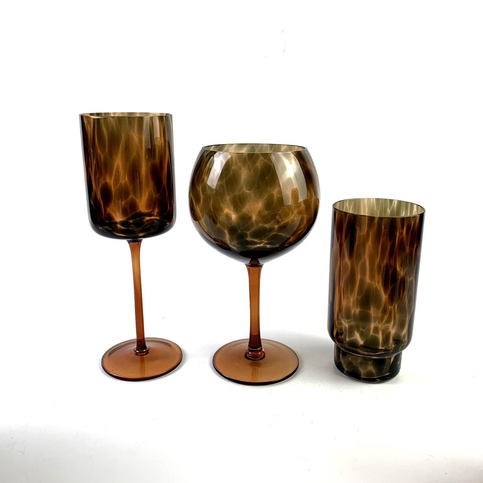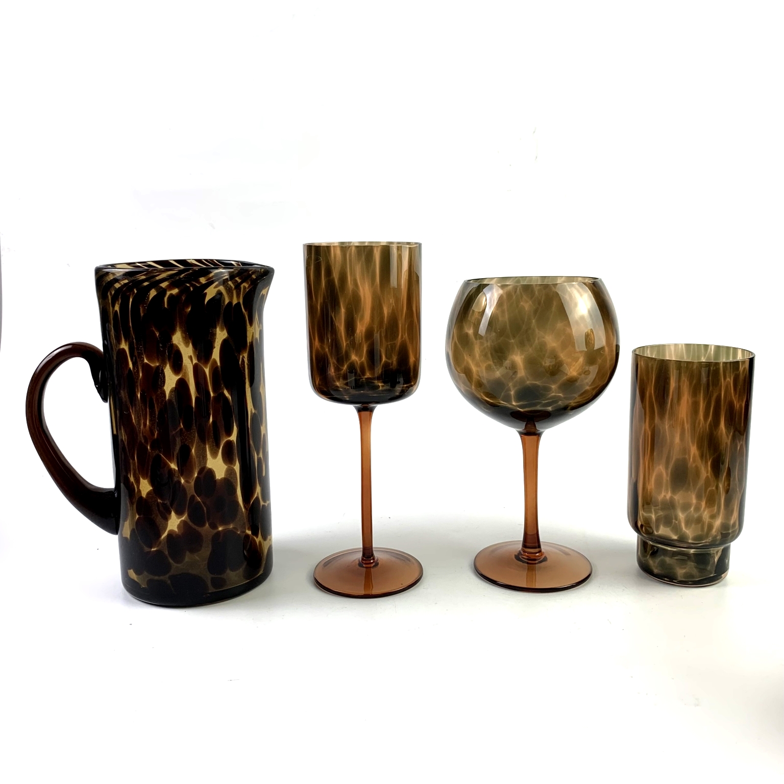With amber leopard coloured designs, this set of glass goblet / pitcher /tumblers will make for an elegant addition to your homeware. These handmade designs are solid color in glass and dishwasher-safe.