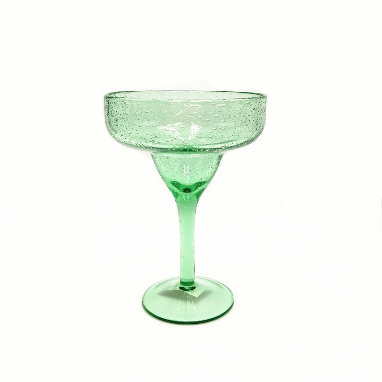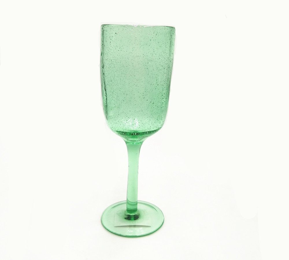 Bubble glass goblet featuring a dynamic, textural finish with a long stem and round base. Each is handcrafted and designed with hundreds of miniature bubbles floating inside the glass, forming unique patterns and optical effects. Soda-lime glass Food safe and Dishwasher safe.