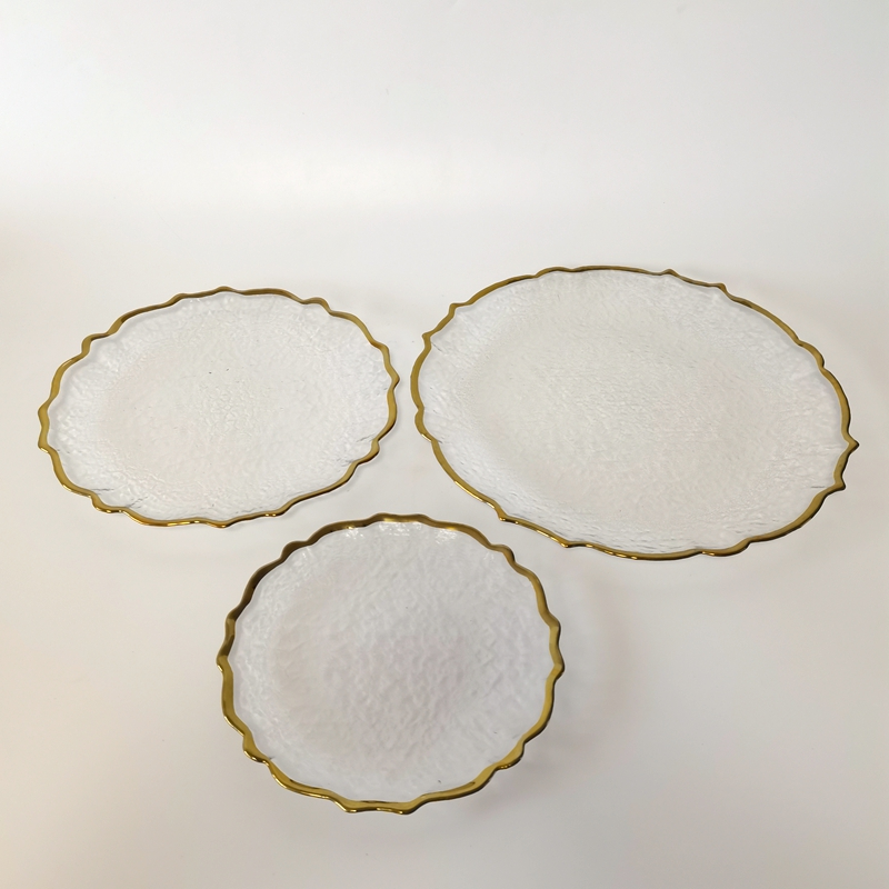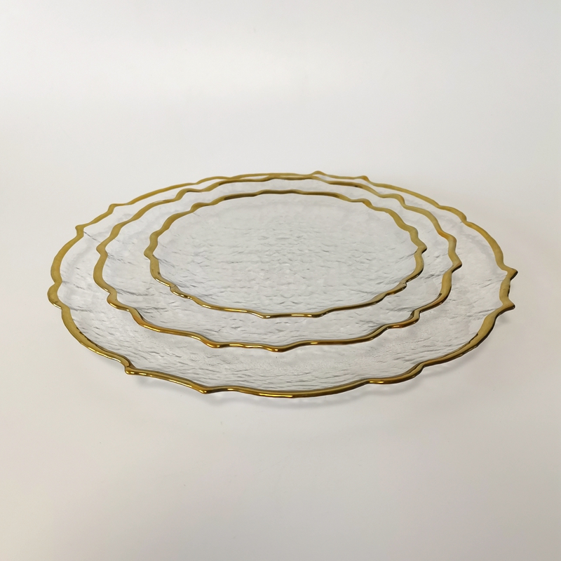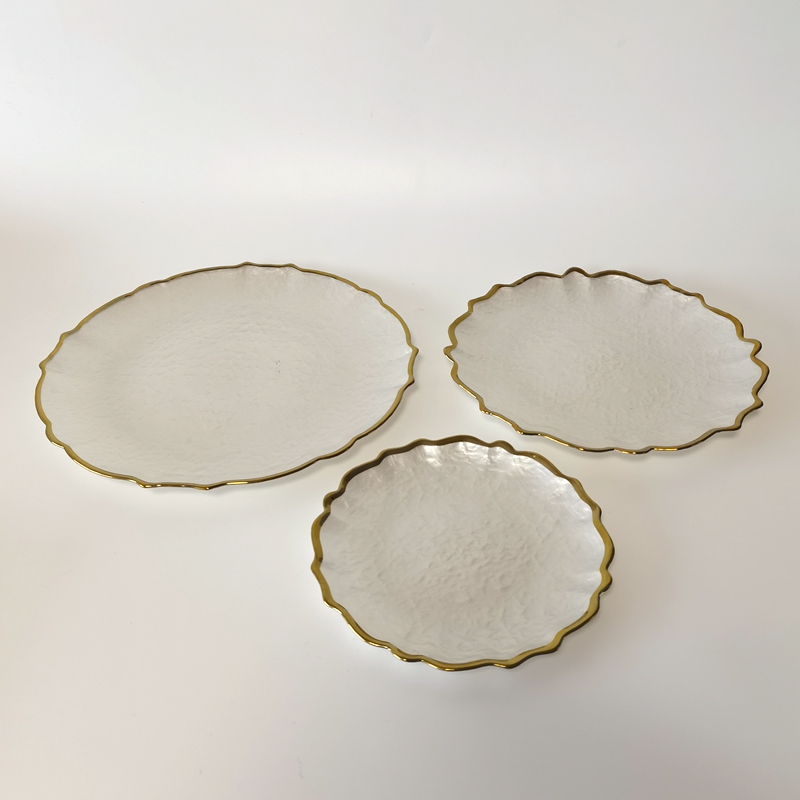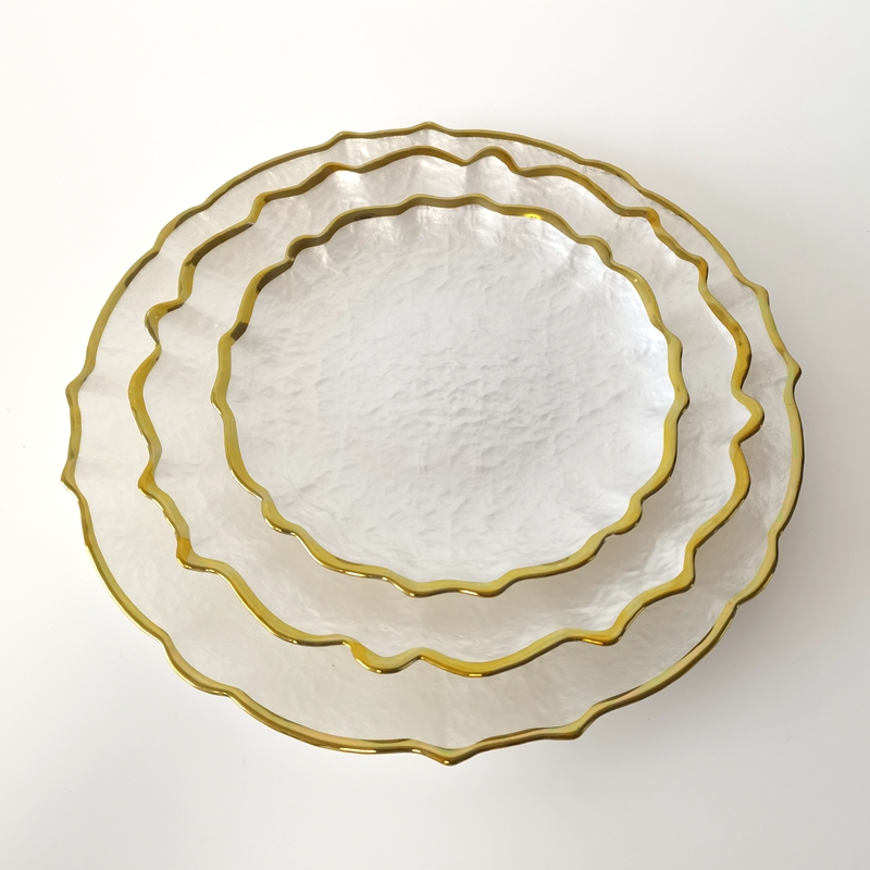 The hand made glass dinner charger plate with gold rim beautifully and adds a sparkling touch to your space!